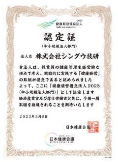 3月8日、経済産業省の元、日本健康会議が選定する行う中小規模の企業等を対象とした「中小規模法人部門 健康経営優良法人2023」に認定されました(公式サイト)