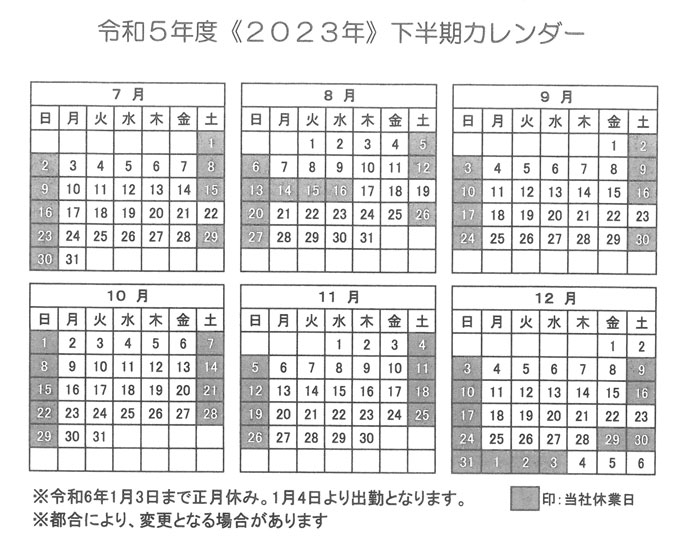 下半期のシングウ技研休日カレンダーが出来ました。