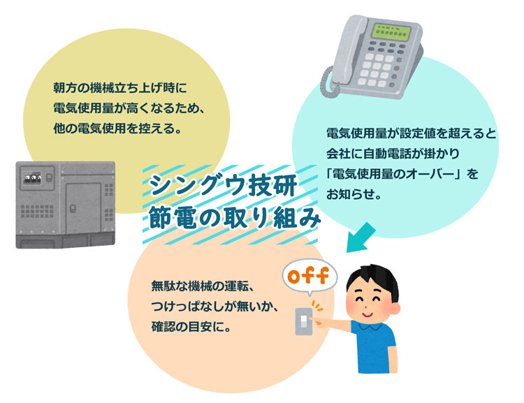 ▼他にも、工場内に電気使用量がすぐわかるメーターを設置したりと、無理のない範囲での