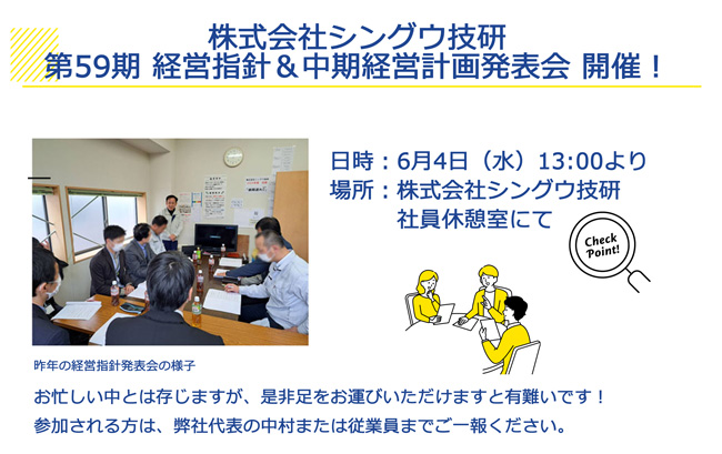 昨年度、58期目にして、シングウ技研として初の経営指針発表会を行いましたが、今年度は2月末で締めた決算書の数字を盛り込んで、中期経営計画発表会も同時に行います。