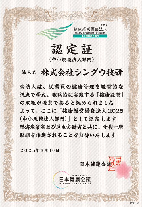 シングウ技研は常に新しい技術を積極的に取り入れ、一人ひとりにとって働きがいのある職場を目指します。仕事を通じ経済成長・未来へと繋がる持続可能な経済活動を基盤にお客様や地域の皆様全ての人とともに取り組んでまいります。